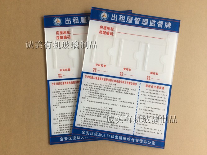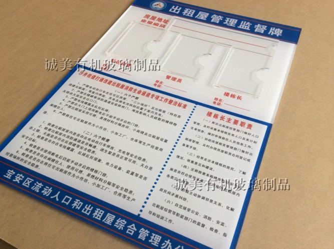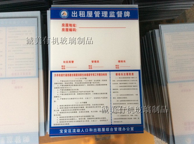 深圳寶安沙井誠美有機玻璃專業加工出租屋管理監督牌 亞克力公告欄 宣傳欄 榮譽牌 信息牌 宣傳欄 榮譽牌 廣告牌 有機玻璃插紙盒廣告牌等,還可按客戶要求訂制加工,歡迎惠顧。